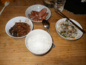 夜はどて飯、サラダ、贈答でいただいた焼き豚