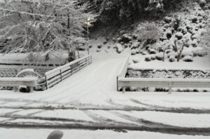 屋根に雪が積もってなぜか暗い、自動点灯の照明も点いてる